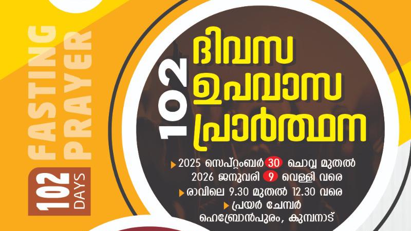 കൺവൻഷനു മുമ്പായി 102 ദിവസത്തെ ഉപവാസ പ്രാർത്ഥന 2025 സെപ്റ്റംബർ 30 മുതൽ പ്രയർ ചേമ്പറിൽ പ്രയർ ബോർഡ് ചെയർമാൻ പാസ്റ്റർ കെ പി കുര്യൻ്റെ നേതൃത്വത്തിൽ നടത്തുന്നതാണ്.